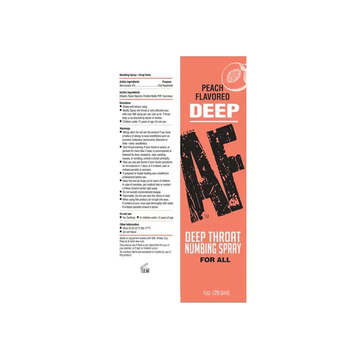 Deep AF Throat Numbing Spray comes in a handy 1oz bottle. Does not contain parabens or sugar. For use: Insert the applicator in your mouth with the tip pointing toward your throat. Spray 2-3 times approximately 2-5 minutes before performing oral sex. Contains 1 fluid ounce (29ml). Quality made in USA by Little Genie.