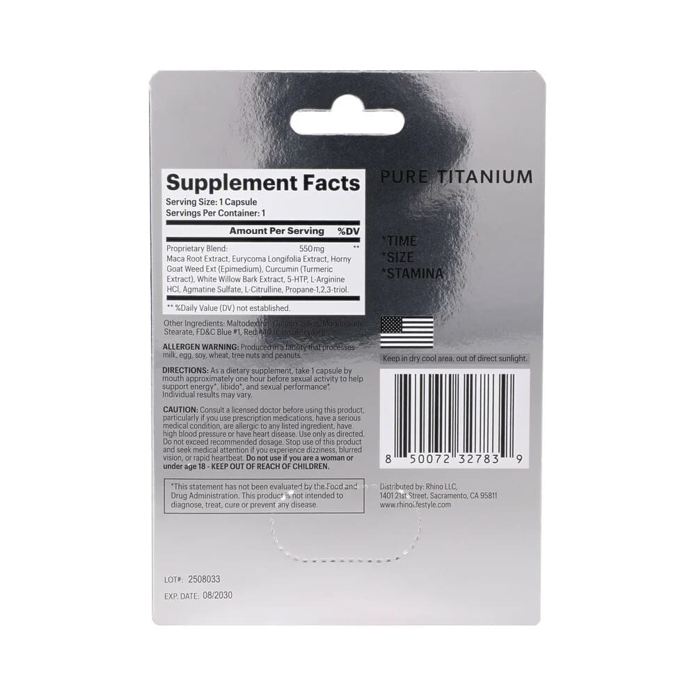 Rhino Pure Titanium Male Enhancement Ingredients: Go Ji Extract, Deng Sen Extract, Atractylodes, Cinnamon Bark, Cuscuta, Dang Gui, Licorice, Codonopsis, Cordyceps, Rubus, Panax Ginseng, Pueraria Lobata, Superoxide Dismutase, Proprietary Blend, Vitamin B12. Made in USA. Use only as directed. Dietary Supplement Disclaimer.