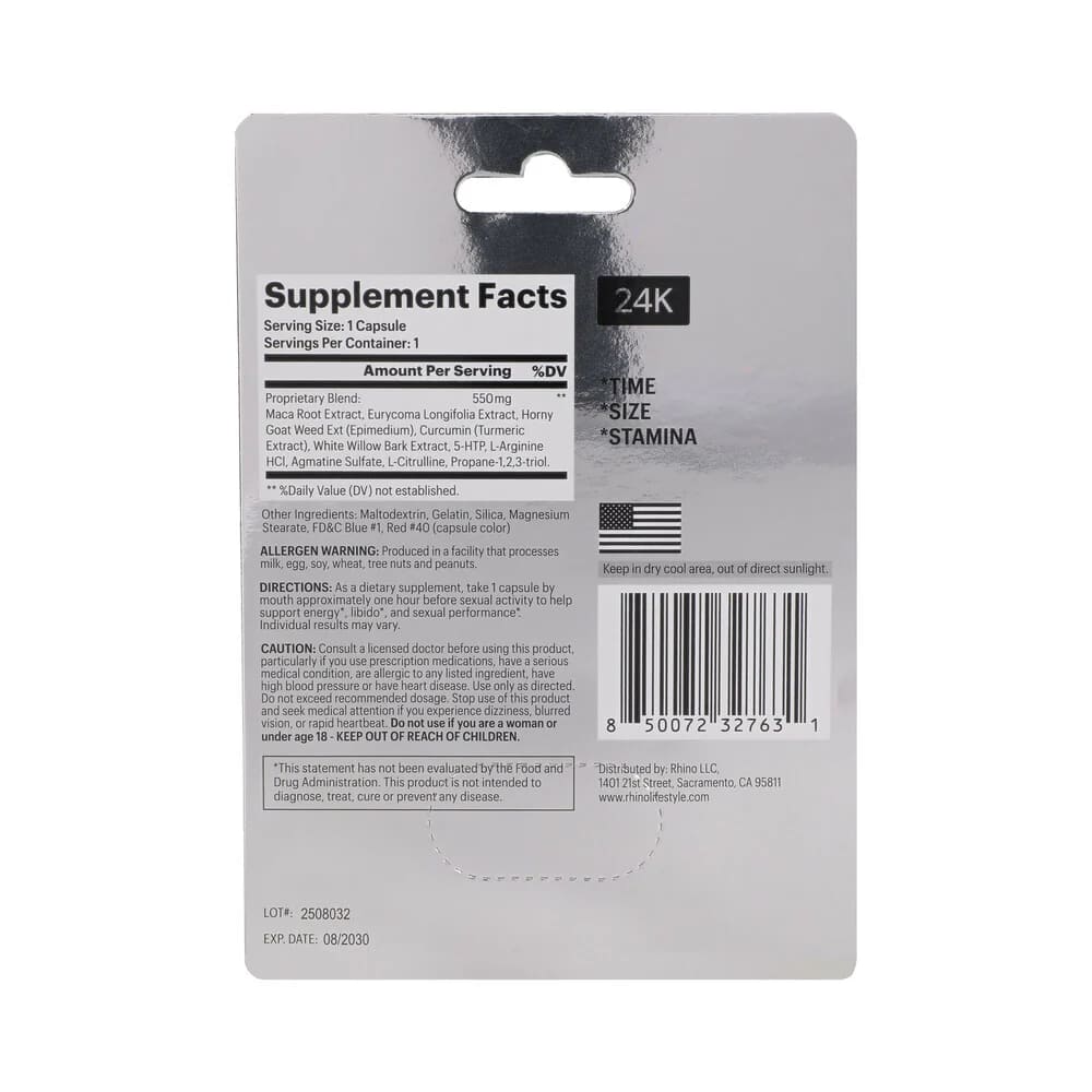 Rhino Platinum 24K Ingredients: Go Ji Extract, Deng Sen Extract, Hawthorne Berries, Cinnamon Bark, Horny Goat Weed, Lotus Seed, Goji Berries, Licorice, Codonopsis, Cordyceps Sinensis, Rubus, Panax Ginseng, Vitamin B12, Proprietary Blend. Made in USA. Use only as directed. Dietary Supplement Disclaimer.
